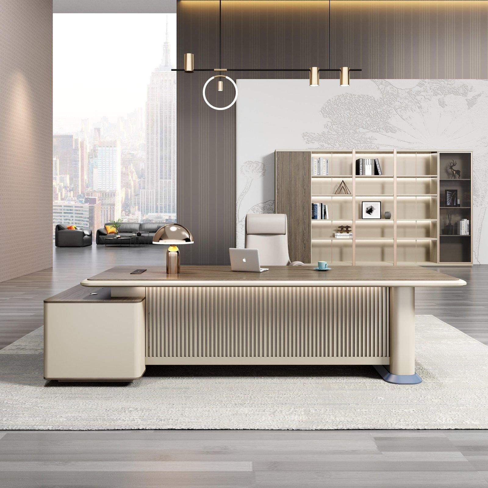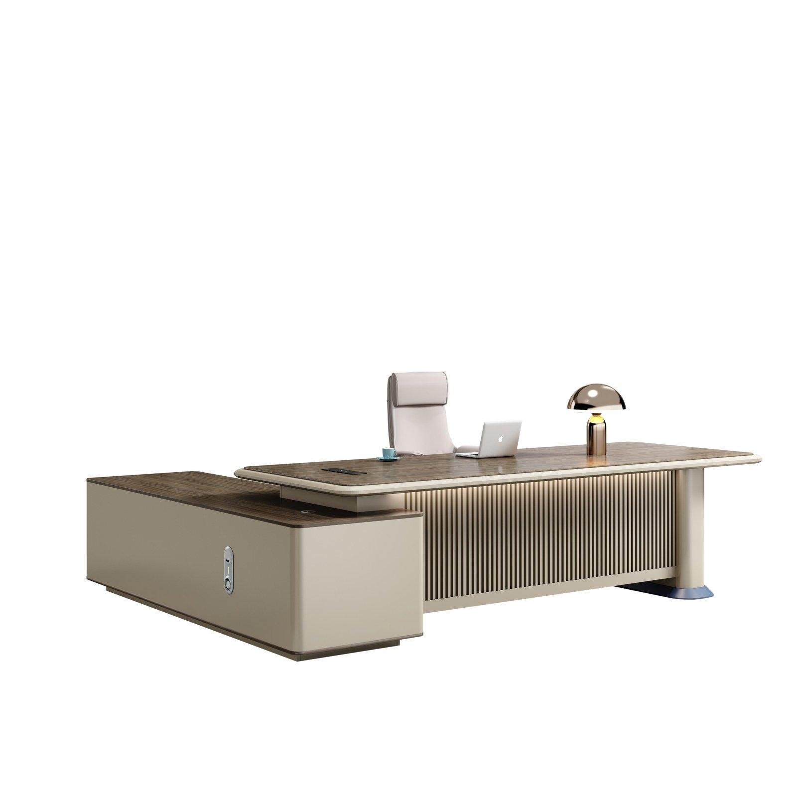 Executive desk,size : 2400*1800*750mm model CEO desktop made of MDF wood covered with a layer of PVC, scratch-resistant and anti-bacterial, thickness of 350 mm.. Front screen made of MDF wood, thickness of 17 mm. And a side extension size : 180 * 60 cm consisting of one door and 2 drawer with lock WITH LED lighting