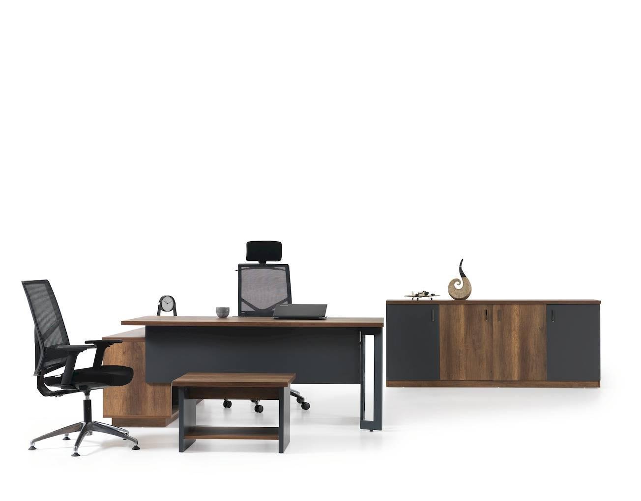 Executive desk model Miro size : 180 cm X 80 cm made of MDF and covered with a layer of HPL that is scratch-resistant and anti-bacterial, thickness of 25 mm, and the office structure is made of electrostatic painted metal Tree shape. With a side accessory consisting of 3 drawers with a lock,and 4 open shelf