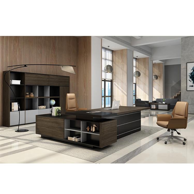 Executive desk,size : 180*240 cm model EDGE, desktop made of MDF wood covered with a layer of HPL, scratch-resistant and anti-bacterial, thickness of 50 mm.. Front screen made of MDF wood, thickness of 17 mm. And a side extension size : 180 * 60 cm consisting of two doors and 3 drawers,