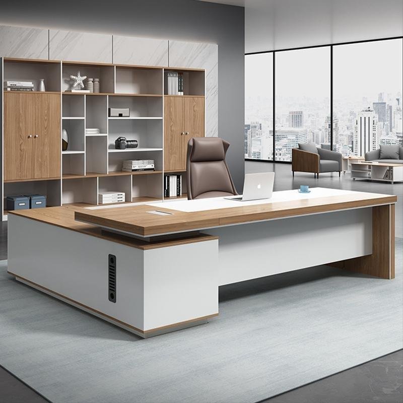 Executive desk,size : 180*240 cm model EDGE, desktop made of MDF wood covered with a layer of HPL, scratch-resistant and anti-bacterial, thickness of 50 mm.. Front screen made of MDF wood, thickness of 17 mm. And a side extension size : 180 * 60 cm consisting of two open shelves and 2 drawers,