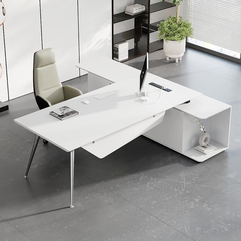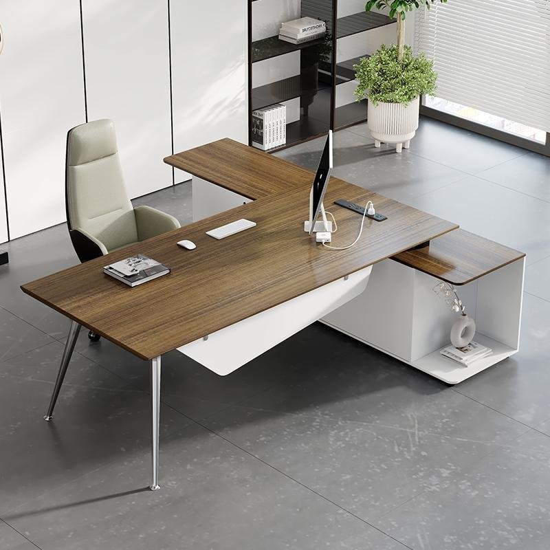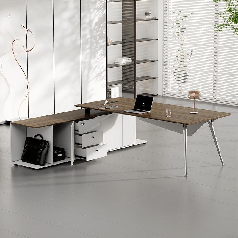 Executive desk model Prime made of MDF thickness 3.5cm with modesty panel MDF thickness 18mm with V leg made of metal chrome size : 200 x 90 cm with side made of MDF thickness 18mm consisting of 3 drawers and two doors with central lock size : 160 cm x 60 cm