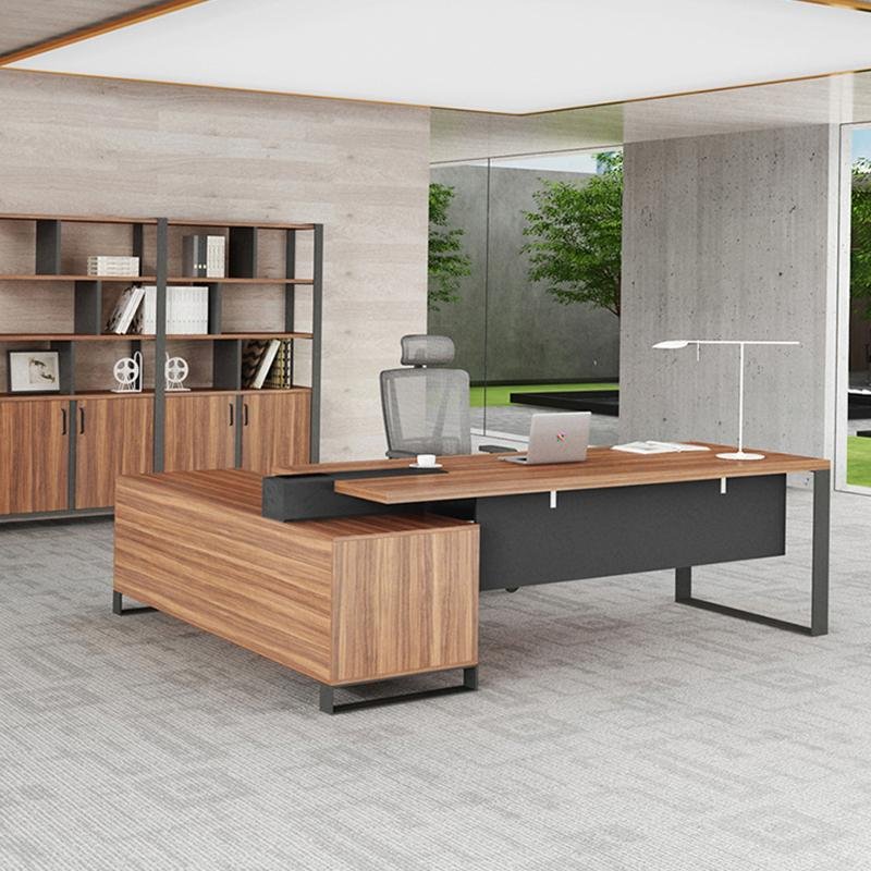 Executive desk model SHARM made of MDF and covered with a layer of HPL that is scratch-resistant and anti-bacterial, thickness of 25 mm, and the office structure is made of electrostatic painted metal O shape. With a side accessory consisting of 3 drawers with a lock, one door and 3 open shelf