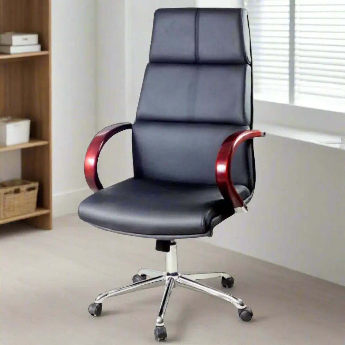 High back chair 1. Pu chair with wood armrest 2. 1 arm mechanism 3.BIFMA gaslift 4.Chrome base 5.60MM castors