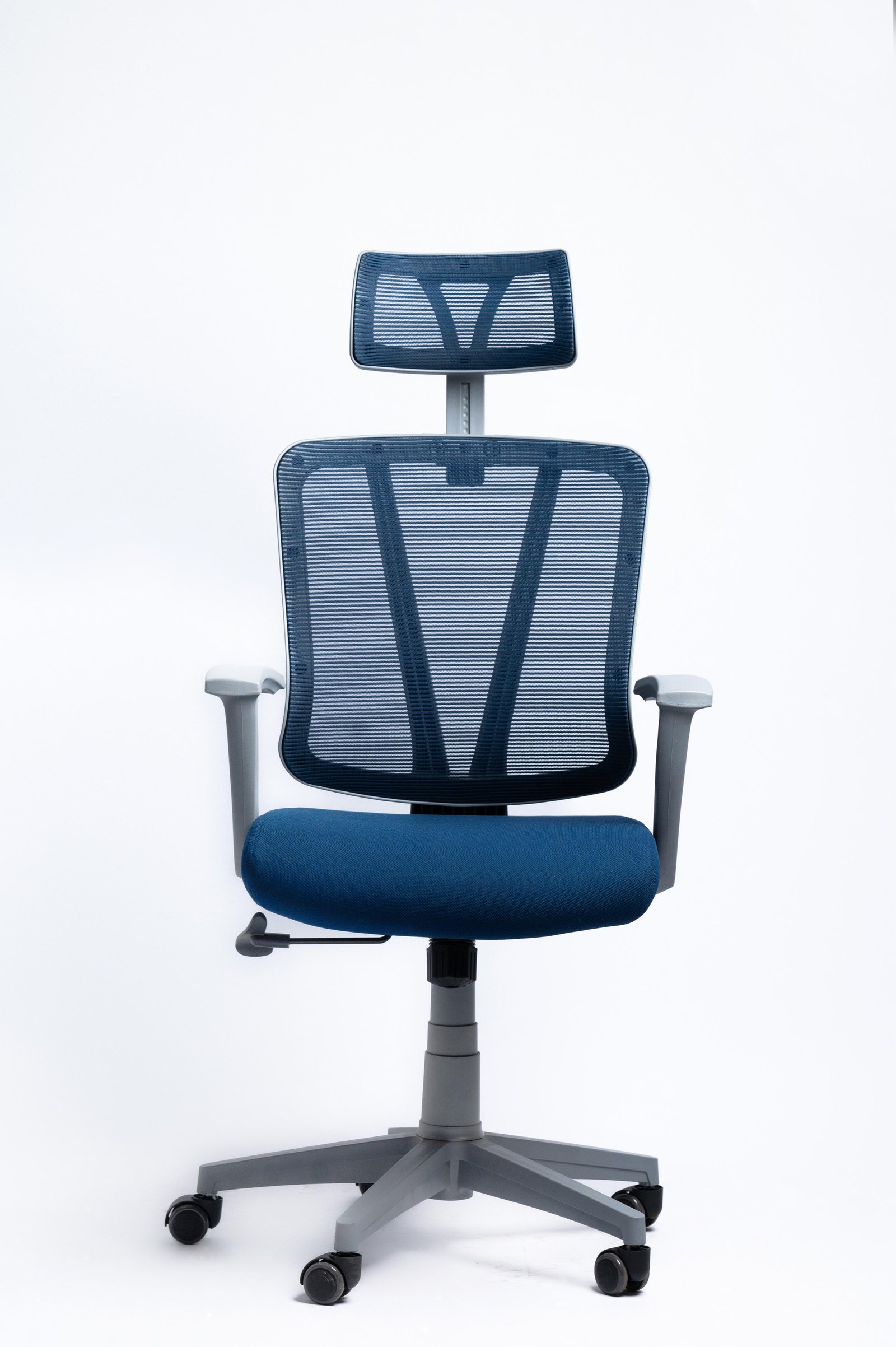 High back chair Gray color 1: Height adjsutable headrest with mesh 2: back with the high quality mesh 3: Fixed amrrest 4: seat for cutting foam, 5: Synchronized-tilt mechanism,Back-locking in 1 position,Height and tilt tension adjustable. 6:BIFMA standard ,Class 3 gaslift with 100mm distance. 7: 1000kgs Pressure standard 330mm size plastic base and PU castor.