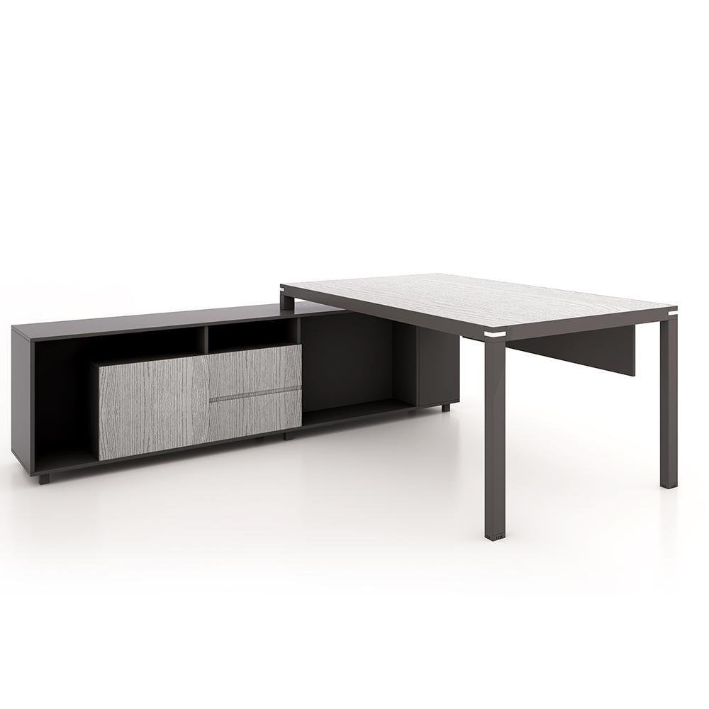 Executive desk model BELLA made of MDF and covered with a layer of HPL that is scratch-resistant and anti-bacterial, thickness of 25 mm, and the office structure is made of electrostatic painted metal U shape. With a side accessory consisting of two drawers with a lock, one door and two open shelf size : 200 * 180 cm