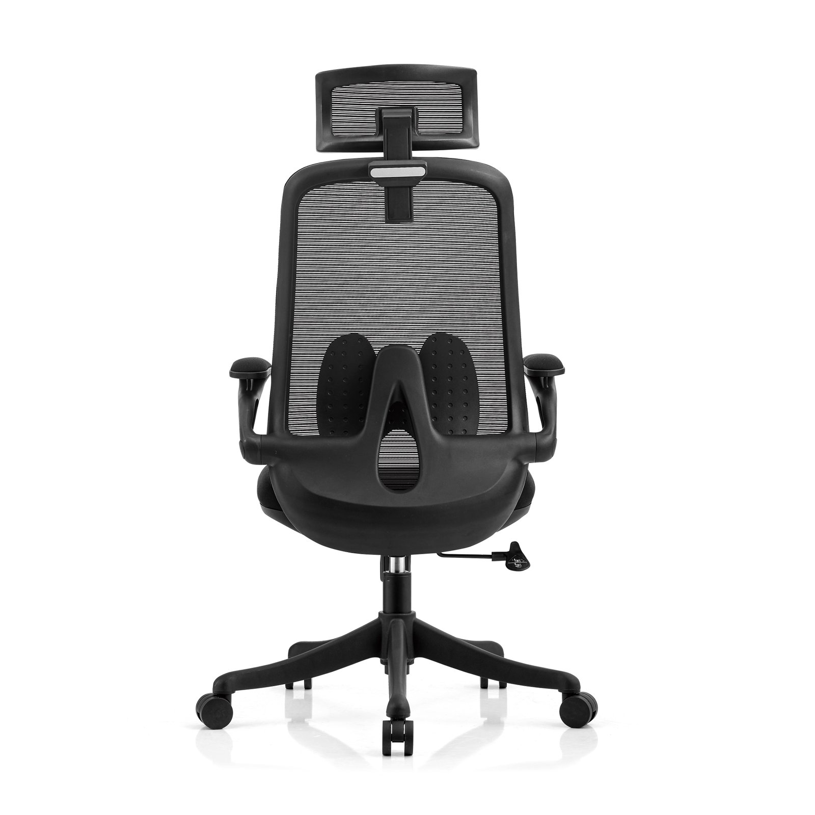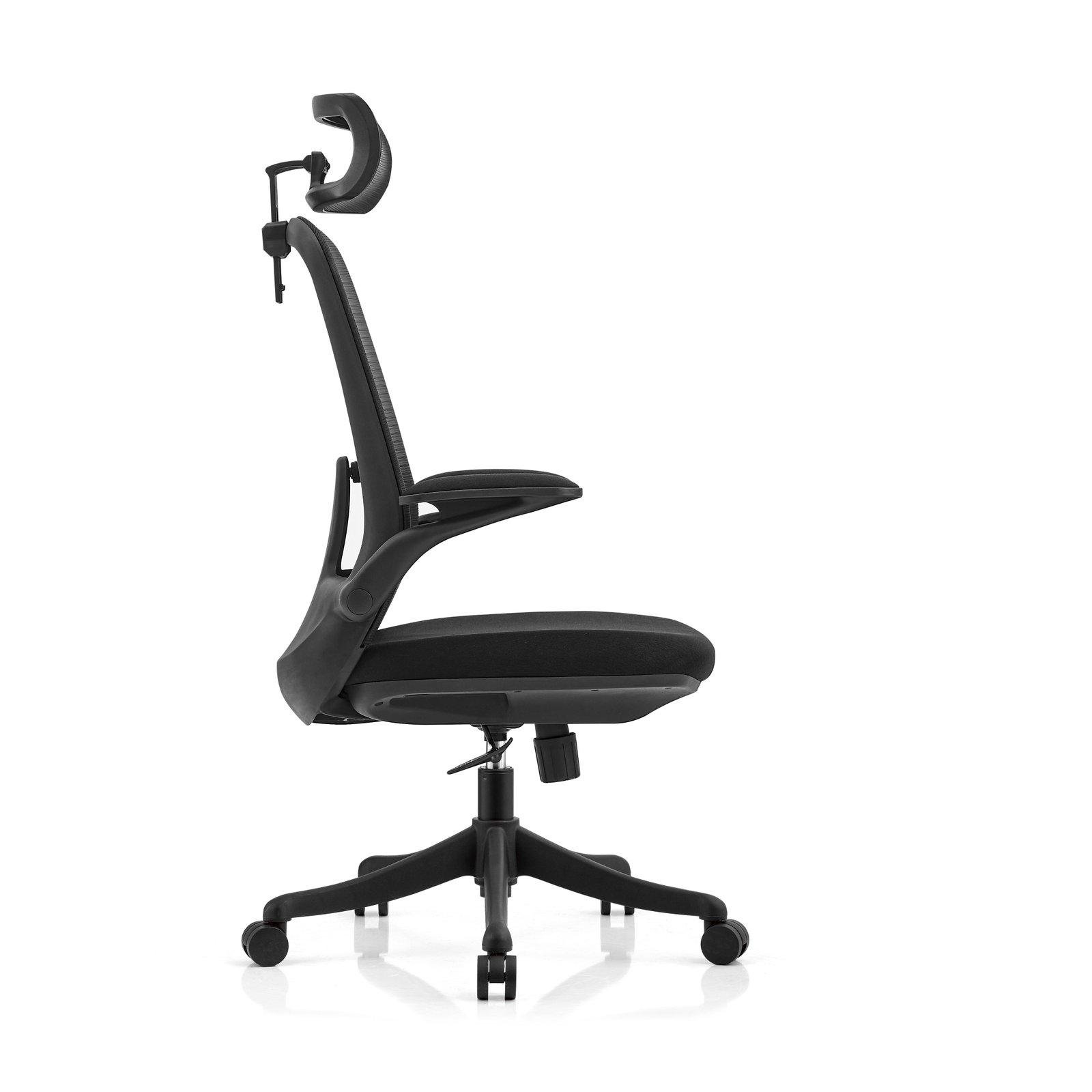 High back chair Adjustabel headrest Mesh back with fixed lumbar suport Fabri&molded foam seat with plastic cover Plastic up adjustabel armrest change multi function mechanism R330mm PP base with D55mm nylon castors