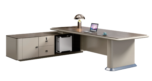 Executive desk,size : 2400*1800*750mm model CEO desktop made of MDF wood covered with a layer of PVC, scratch-resistant and anti-bacterial, thickness of 350 mm.. Front screen made of MDF wood, thickness of 17 mm. And a side extension size : 180 * 60 cm consisting of one door and 2 drawer with lock WITH LED lighting