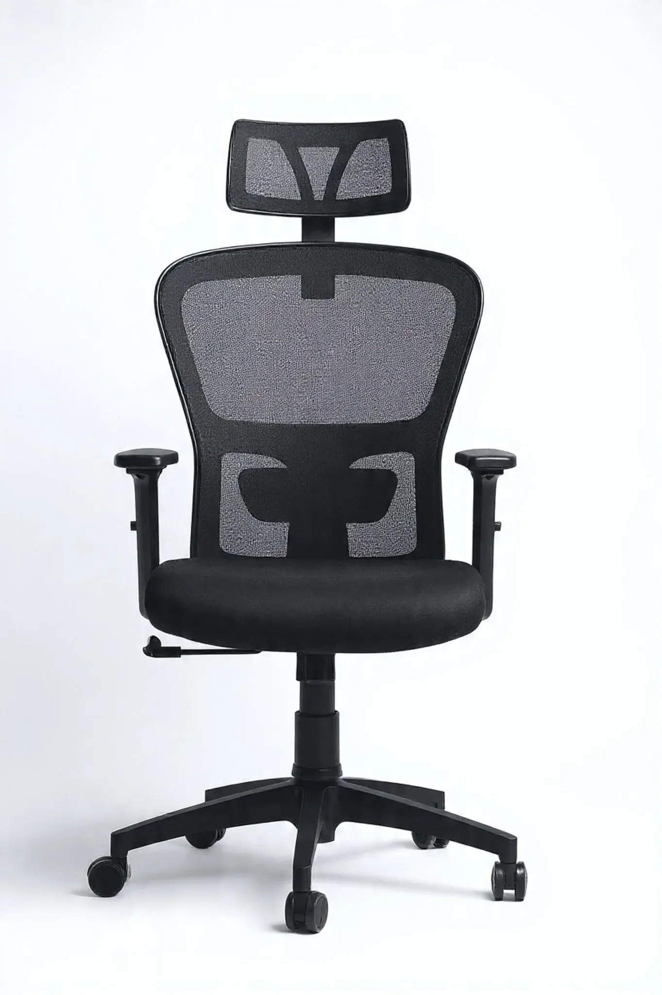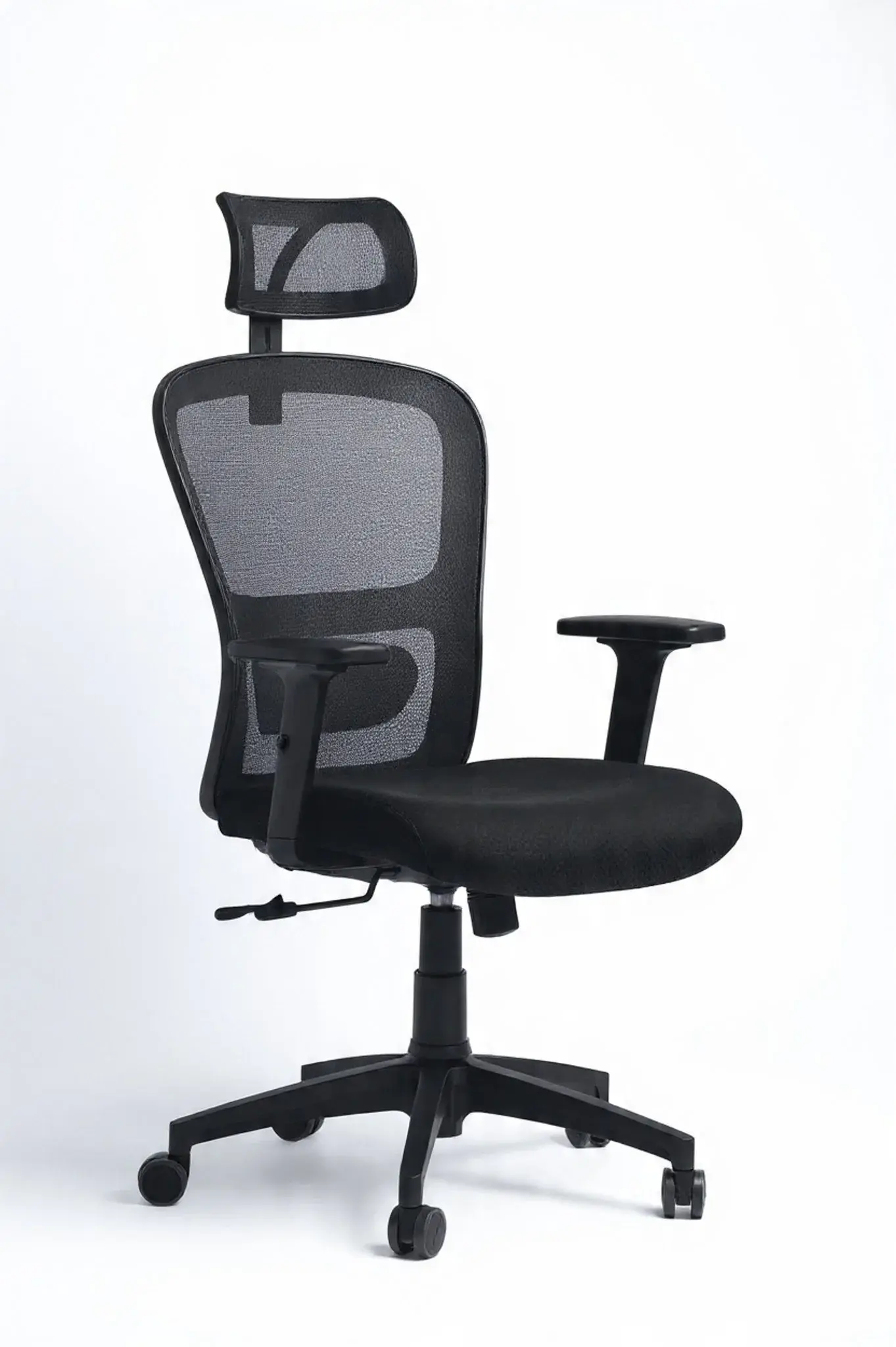 High back chair color black mesh with fixed lamper support upholstered 1: back with the high quality mesh 2: 2D armrest 3: seat for cutting foam, 4: Synchronized-tilt mechanism,Back-locking in 1 position,Height and tilt tension adjustable. 5: plastic base and PU castor