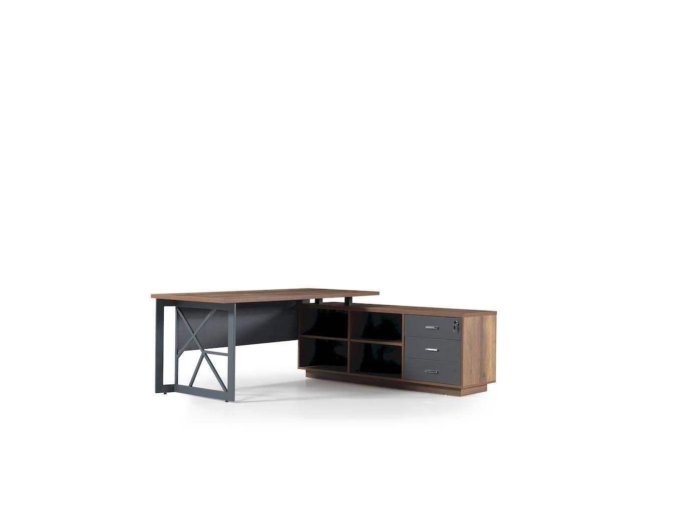 Executive desk model Miro size : 180 cm X 80 cm made of MDF and covered with a layer of HPL that is scratch-resistant and anti-bacterial, thickness of 25 mm, and the office structure is made of electrostatic painted metal Tree shape. With a side accessory consisting of 3 drawers with a lock,and 4 open shelf