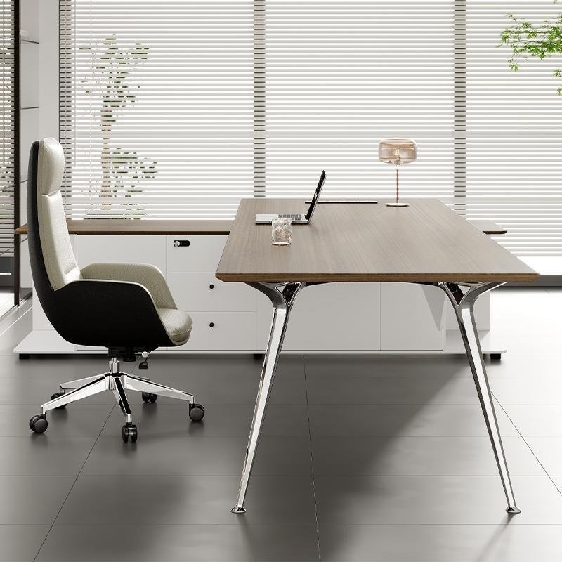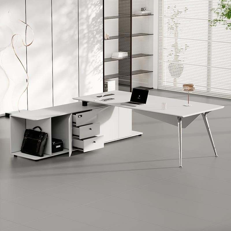 Executive desk model Prime made of MDF thickness 3.5cm with modesty panel MDF thickness 18mm with V leg made of metal chrome size : 200 x 90 cm with side made of MDF thickness 18mm consisting of 3 drawers and two doors with central lock size : 160 cm x 60 cm